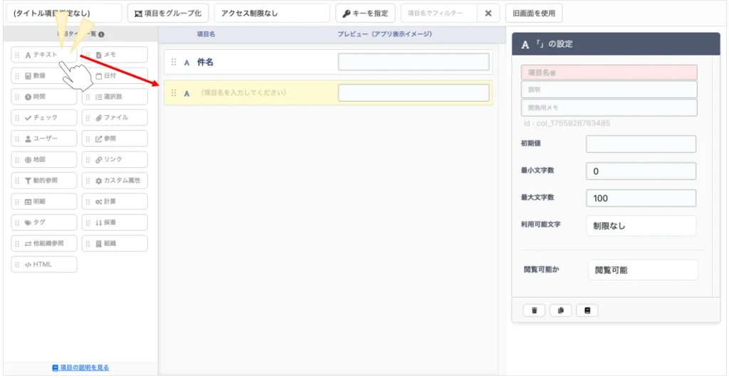 項目を追加する場合は、画面左の「項目タイプ一覧」から追加したい項目タイプを選択して、以下のいずれかの方法で追加します。