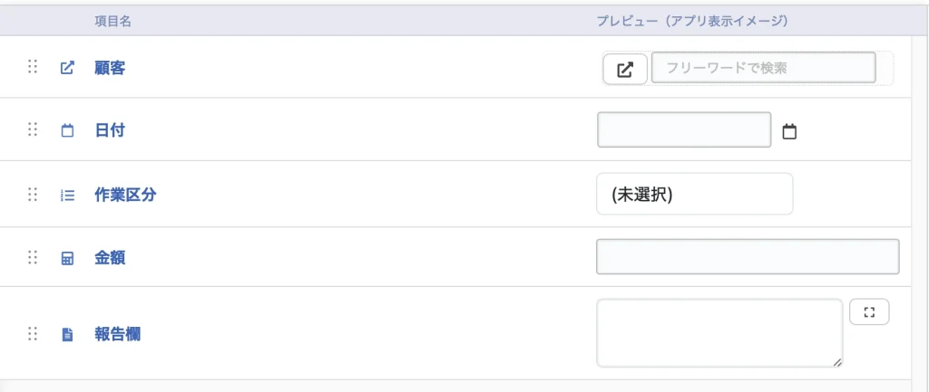 顧客=必須、日付=必須、作業区分=任意、金額=任意、報告欄=未使用