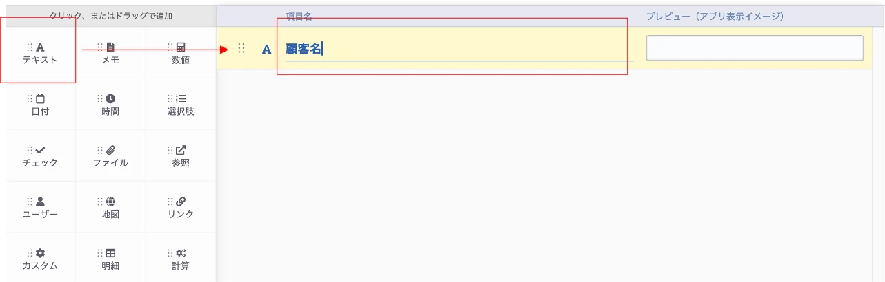 初期状態のモデル編集画面では、データ設定を行える状態になっています。そのまま、左側の項目パレットから「テキスト」をクリック(または中央にドラッグ)して項目を追加します。項目名を編集できる状態になっているので、「顧客名」と入力します。改めて項目名を編集可能にする場合は、中央に追加した項目をクリックします。